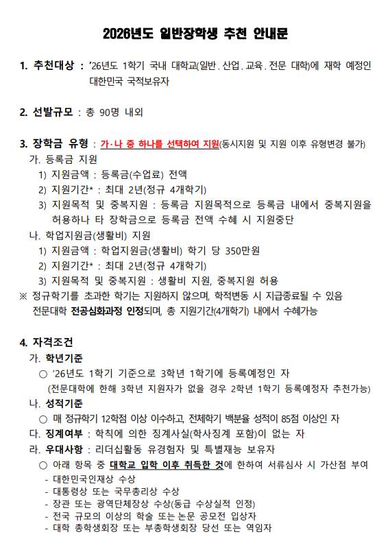 [교외장학] 2026년도 한국지도자육성장학재단 신규장학생 선발 안내