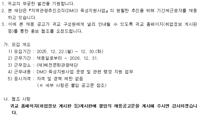 2026년도 제1회 기간제근로자(지역관광추진조직 육성사업) 채용 공고 홍보